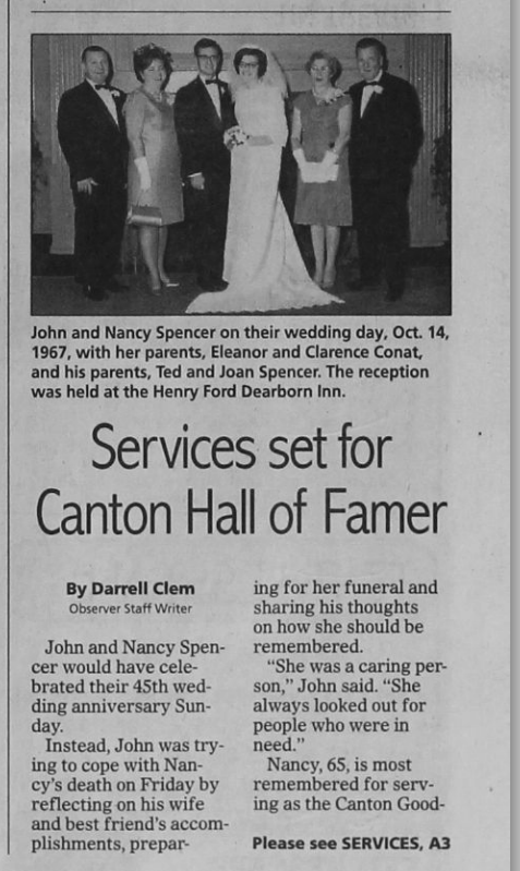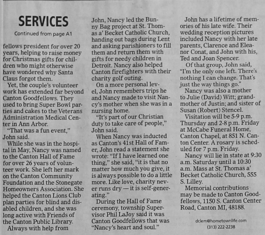 Nancy chose to spend every moment she could, giving selflessly in causes such as the Canton Goodfellows organization and Friends of the Canton Public Library despite an overwhelming number of physical limitations. We all miss her!